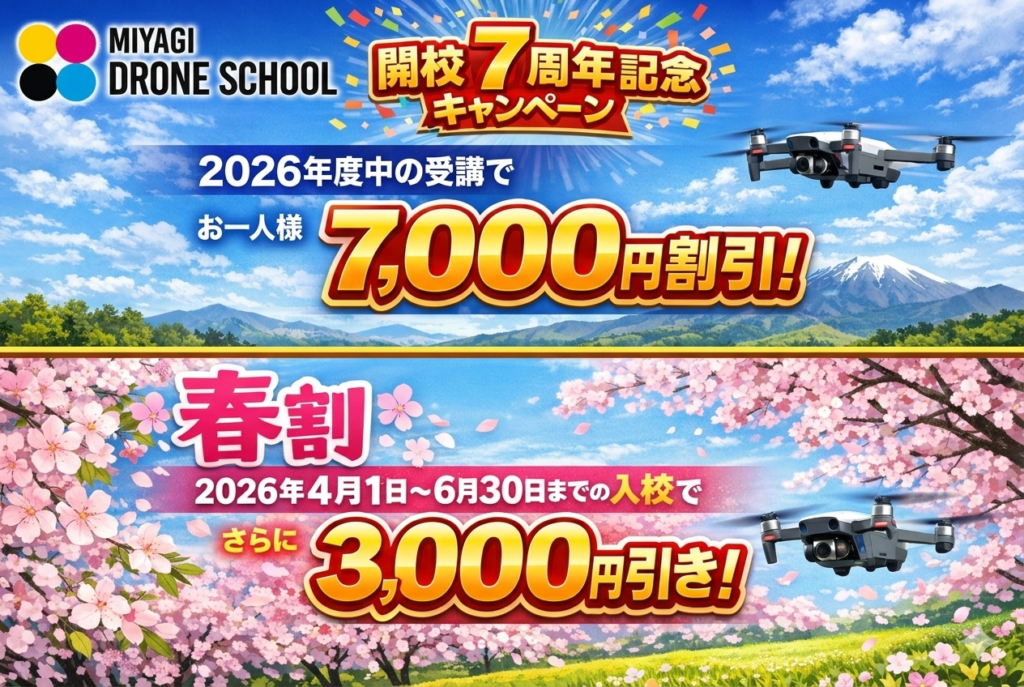 過去に宮城ドローンスクールの各種講習(JUIDA講習など)を卒業された方は、5,000円を割引いたします。